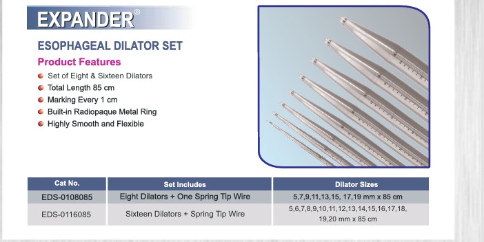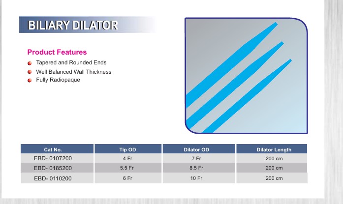 MSD - Multi Stage Dilation Esophageal Dilator Set Biliary Dilator MSD Dilation Balloon Esophageal Dilator Set Biliary Dilator BILIARY DILATOR Product Description Biliary dilator is used to dilate a narrowed area (stricture) of the bile duct. Product Features: Tapered and Rounded Ends Well Balanced Wall Thickness Fully Radiopaque DOWNLOAD LEAFLET DOWNLOAD CATALOGUE < Previous Next > Product Video Watch Now!