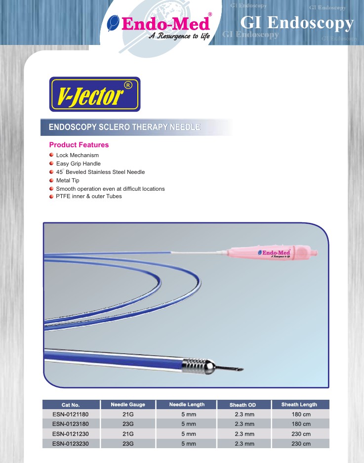 Endo-Med V-Jector Endoscopic Sclerotherapy (EST) Needle Catheter are used for endoscopic injection of sclerosing agent into gastrointestinal track to control actual or potential bleeding lesions.. This device is supplied sterile and is intended for single use only.