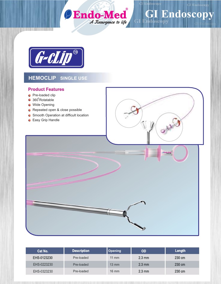 Endo-Med G-Clip (Hemoclip) is used through the working channel of endoscope, which is indicated for clip placement within digestive tract for the purpose of mechanical pressure treatment of bleeding of small arteries, Hemostasis of Bleeding ulcers, Mucosal/sub-mucosal defects etc. The device is supplied sterile and intended for single use only.