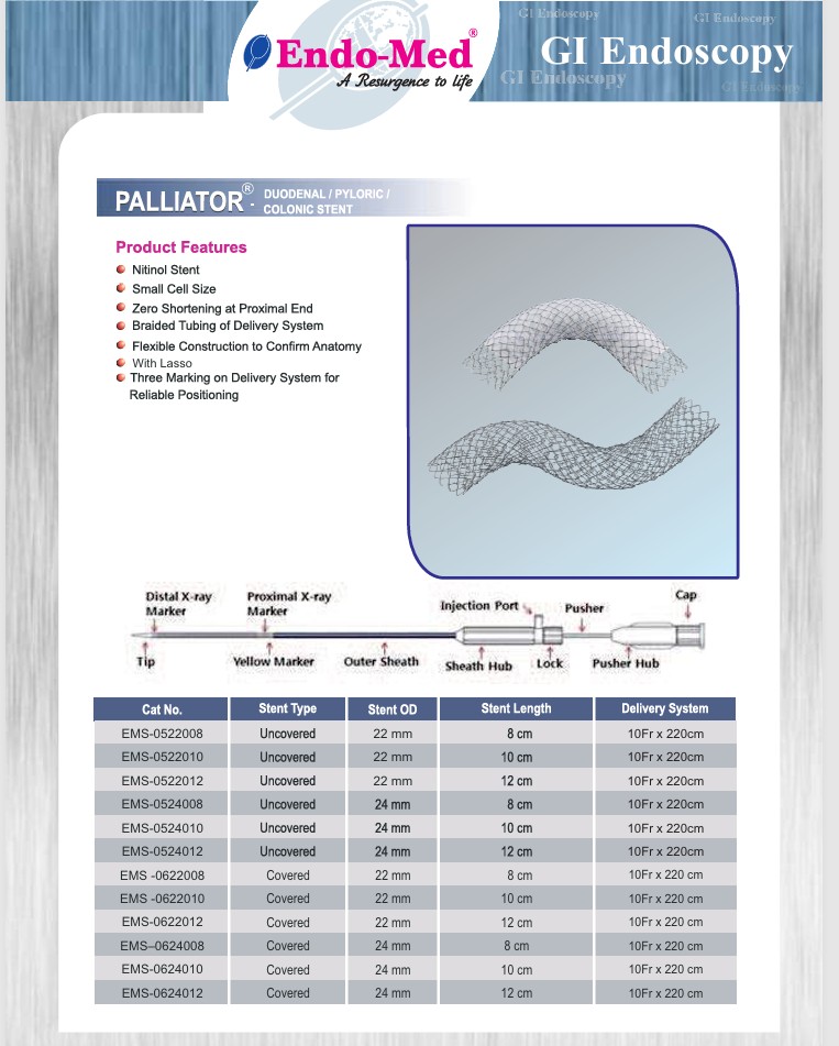 Palliator – Duodenal/Pyloric & Colonic Stents are useful in relieving malignant gastric outlet obstruction & gastro duodenal obstruction produced by malignant neoplasms. The colonic stents is indicated for the palliative treatment of Colonic strictures caused by malignant neoplasm and to relieve large bowel obstruction prior to colectomy in patients with malignant strictures. It is a flexible, fine mesh tubular prosthesis which has radiopaque markers on each end and at the center.