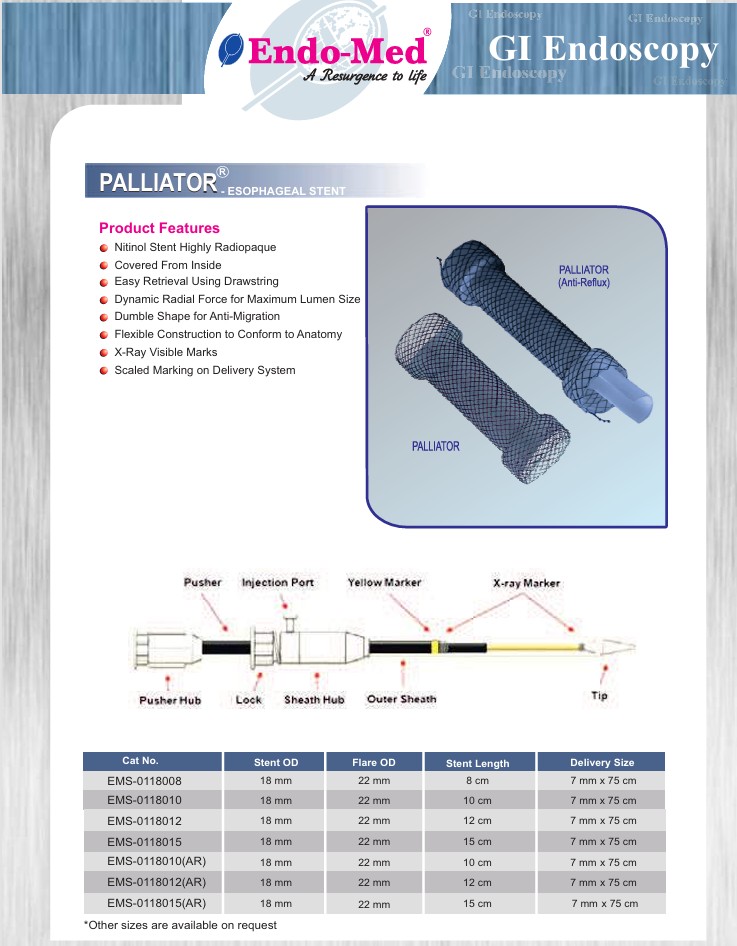 Esophageal stents are used for palliating dysphagia from malignant obstruction. They are also used with increasing frequency in the treatment of esophageal perforation, as well as benign strictures from a variety of causes. The stent is made of Nitinol wire. It is a flexible, fine mesh tubular prosthesis which has radiopaque markers on each end and at the center. The device is used with the help of Flexible Gastro scope under fluoroscopy vision.